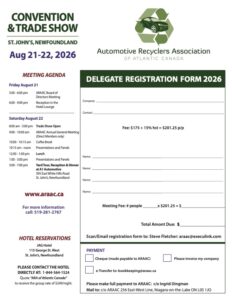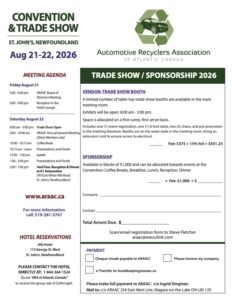 Please call 1-844-564-1524 and reference "Automotive Recyclers Association of Atlantic Canadaβ to receive the discounted room rate of $259 per night. Cut off date for booking is 5 pm on Monday, July 20, 2026.